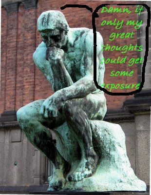 Here’s your chance, we promise to do all we can to support your efforts at expressing yourself by giving your work front and center billing on this blog. We are a growing organization, so baby, get on board, its all up from here! Our staff is diligently working day and night to develop cost-free ways to promote this blog, so get on while the gettin’s good!
