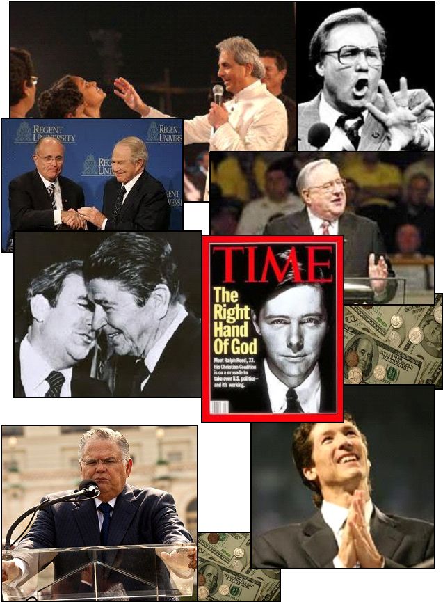 From top left clockwise: Benny Hinn, Jimmy Swaggert, Jerry Falwell, Ralph Reed, Joel Olsteen, unknown, Falwell and Reagan, Guiliani and Pat Robertson